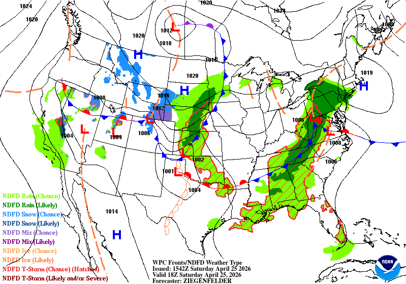 Here is a national animation of weather fronts and precipitation forecasts with four 6-hour projections of the conditions that will apply covering the next 24 hours and a second day of two 12-hour projections the second of which is the forecast for 48 hours out and to the extent it applies for 12 hours, this animation is intended to provide coverage out to 60 hours. Beyond 60 hours, additional maps are available at links provided below. The explanation for the coding used in these maps, i.e. the full legend, can be found here although it includes some symbols that are no longer shown in the graphic because they are implemented by color-coding.