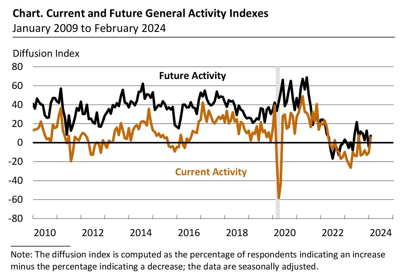 The New York Fed’s February 2024 Empire State Manufacturing Survey general business conditions index rose forty-one points but remained negative at -2.4. New orders declined modestly, while shipments edged higher. Unfilled orders continued to shrink, and delivery times continued to shorten.